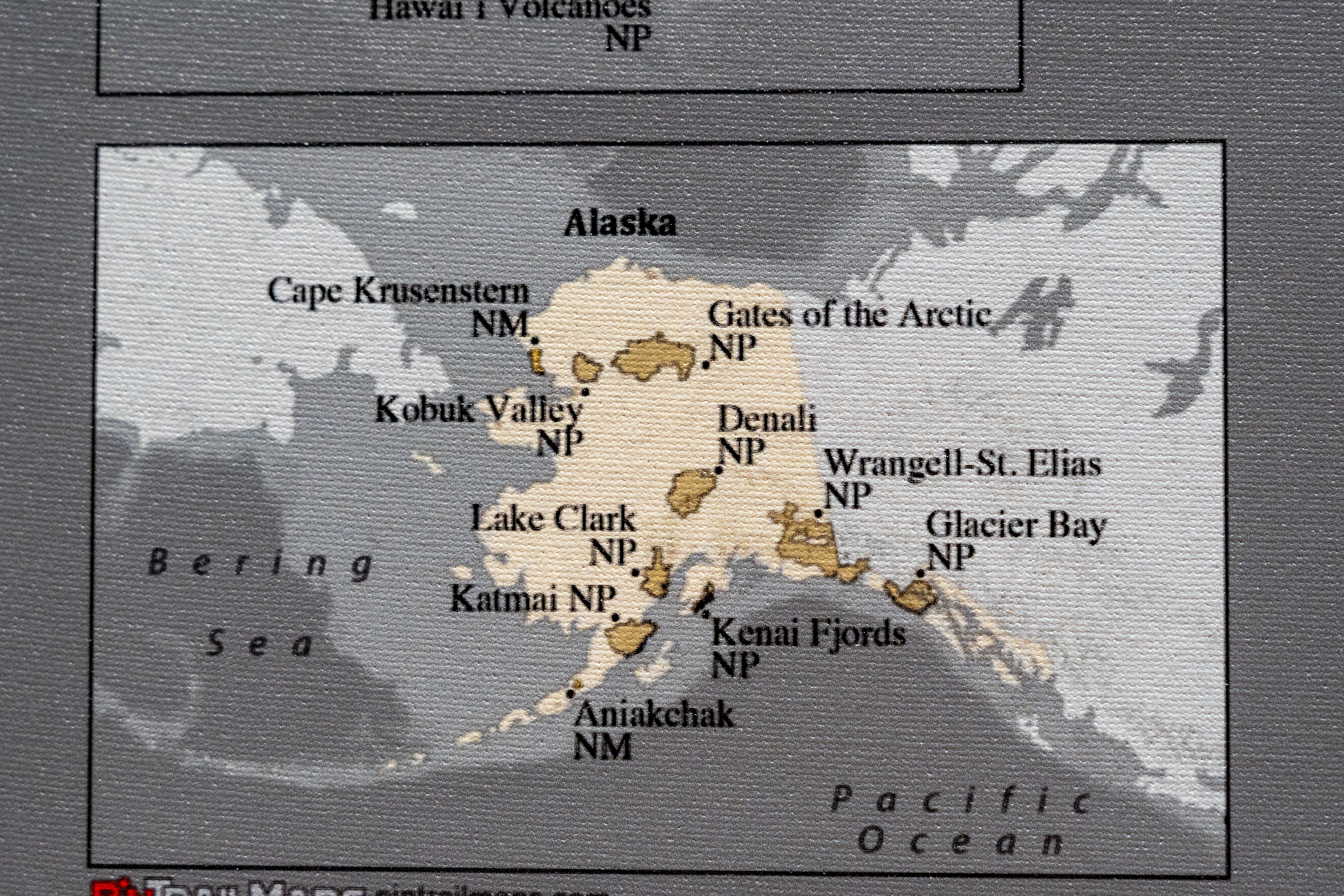 This USA map with terrain background features national parks and monuments managed by the National Park Service.